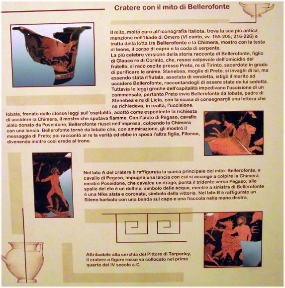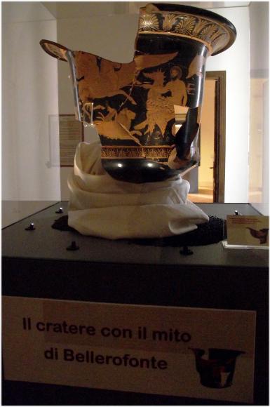 (ACR) - Un vaso a figure rosse racconta il mito di Bellerofonte. L’impavido eroe impugna una lancia e si accinge a colpire con vigore la Chimera, creatura mostruosa che sputa fiamme, con la testa di leone, il corpo di capra e la coda di serpente. Accanto sulla destra c’è Poseidone che cavalca un cavallo marino e punta il tridente verso Pegaso, il cavallo alato. Alle spalle del dio un delfino, simbolo delle acque. Mentre sulla sinistra una Nike alata e coronata, simbolo della vittoria. E ancora: un Sileno barbato con una benda sul capo e una fiaccola in mano. Sono le scene, ancora ben visibili e distinguibili, del mito di Bellerofonte (βελλεροφῶν o βελλεροφόντης “uccisore di Bellero” ovvero Ipponoo che così fu soprannominato dopo che ebbe ucciso Bellero, tiranno di Corinto) dipinte sullo splendido cratere a calice in ceramica a decorazione geometrica, a figure rosse e a vernice nera, risalente al primo quarto del IV secolo a.C. e attribuibile alla cerchia del Pittore di Tarporley: è il pezzo forte del Museo Civico Janora, nel cuore antico di Irsina, in origine Montepeloso (foto n.1-4).