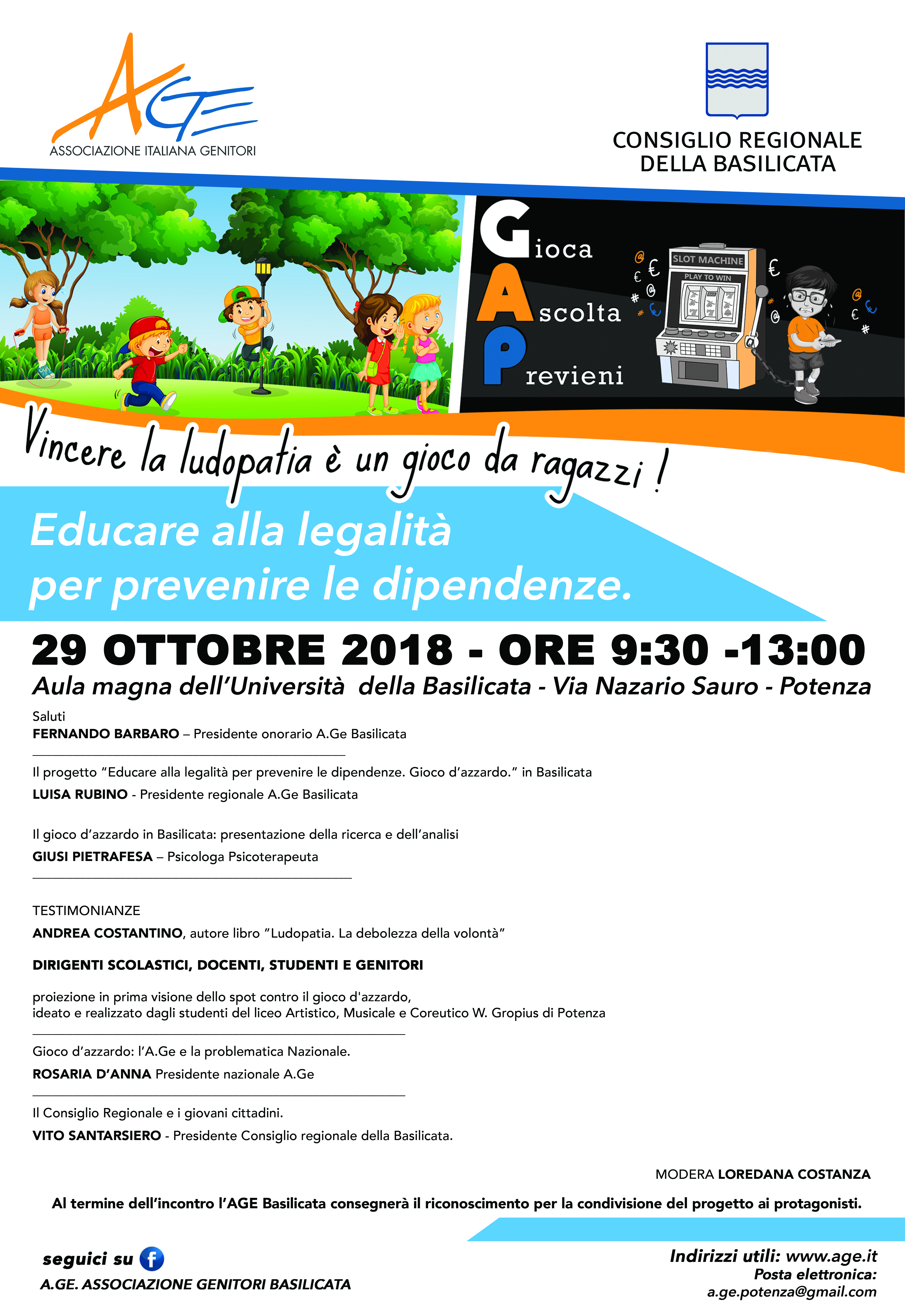 (ACR) - “Gioca, Ascolta, Previeni. Vincere la ludopatia è un gioco da ragazzi”. Questo il titolo di progetto che sarà presentato nel corso di un incontro promosso dal Consiglio regionale della Basilicata e dall’Associazione genitori di Basilicata (Age) che si svolgerà a Potenza lunedì 29 ottobre, con inizio alle ore 9.30 nell’Aula magna della Università degli studi della Basilicata in via Nazario Sauro.