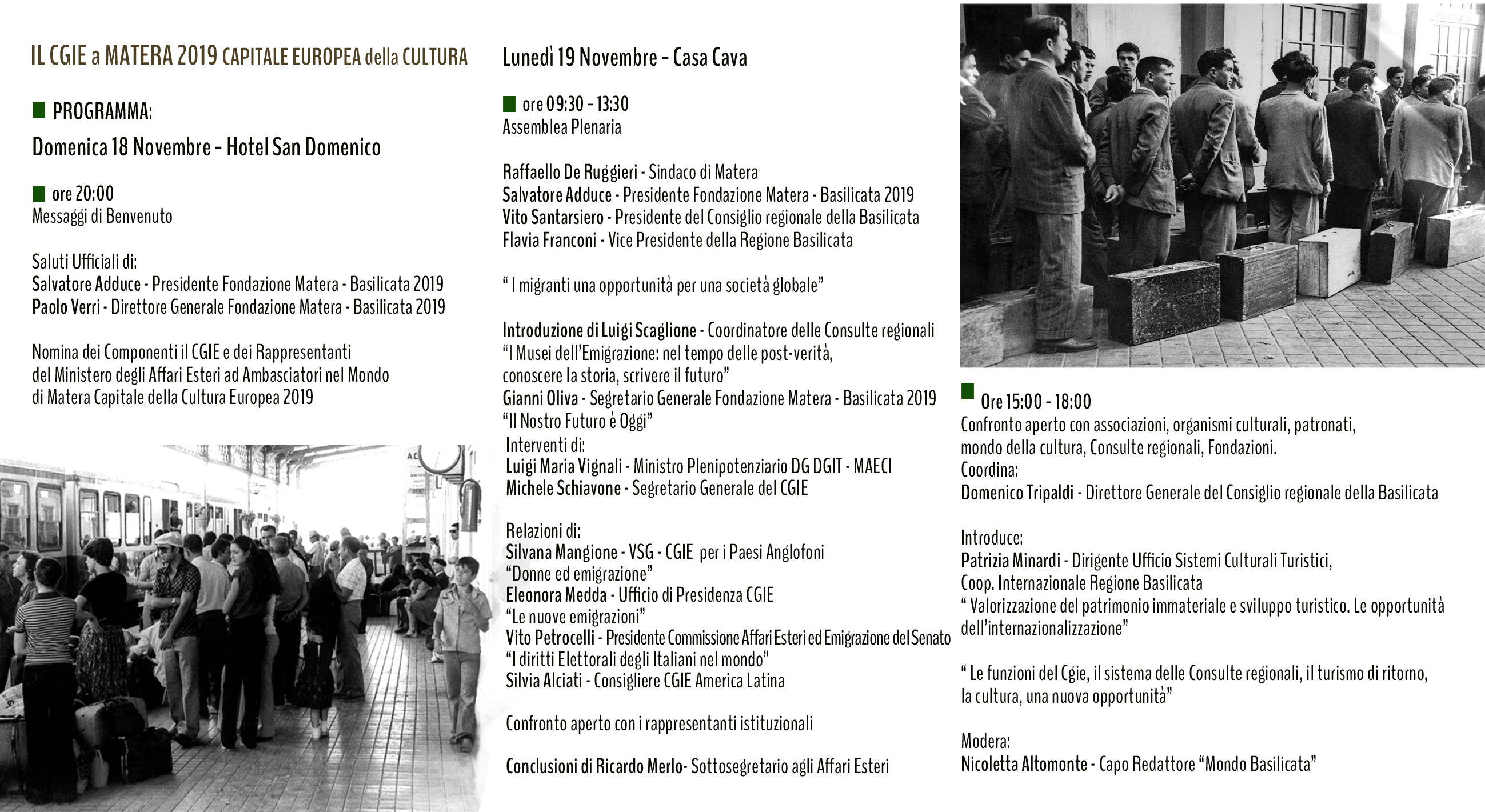Nel corso della due giorni si parlerà anche delle tematiche relative al sistema dell’emigrazione italiana nel mondo su iniziativa della presidenza del Consiglio regionale della Basilicata. Nella serata del 18 novembre inoltre tutti i presenti saranno nominati “Ambasciatori di Matera capitale della cultura europea”.